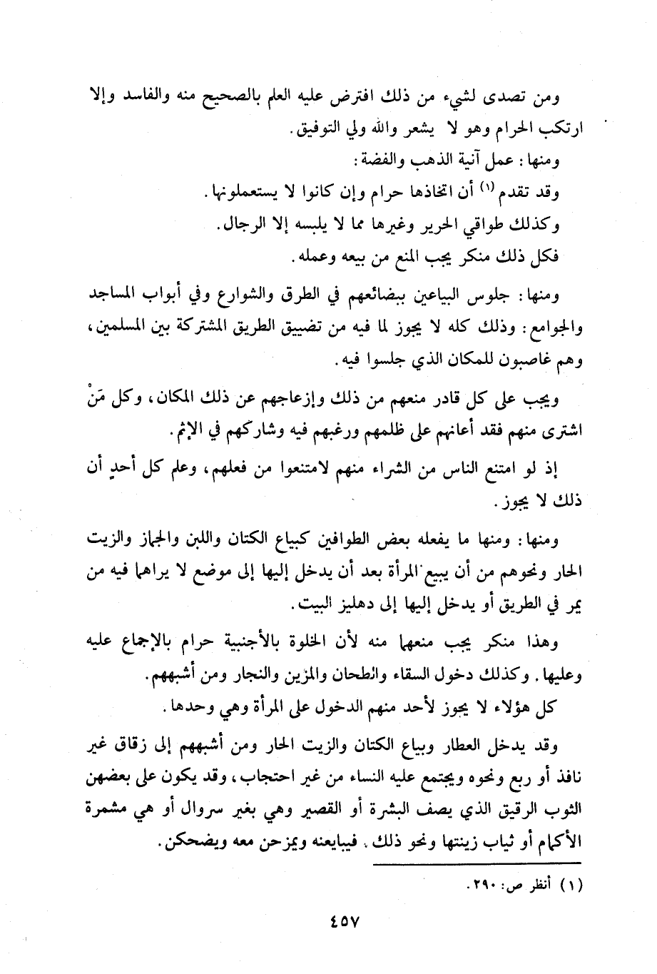 وقد يدخل العطار وبياع الكتان والزيت الحار ومن أشبههم إلى زقاق غير نافذ أو ربع ونحوه ويجتمع عليه النساء من غير احتجاب، وقد يكون على بعضهن الثوب الرقيق الذي يصف البشرة أو القصير وهي بغير سروال أو هي مشمرة الأكمام أو ثياب زينتها ونحو ذلك، فيبايعنه ويمزحن معه ويضحكن.