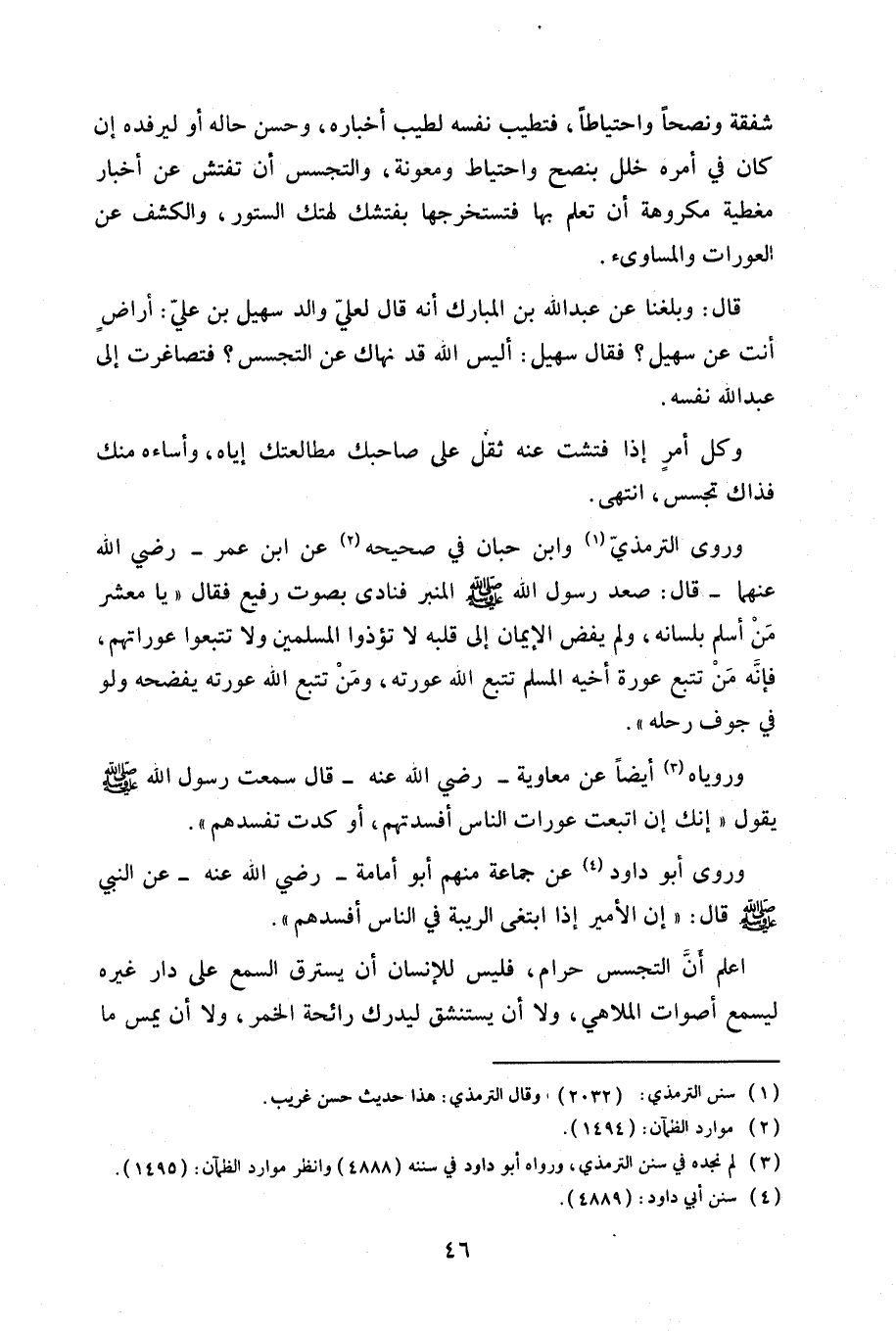 وروياه أيضاً عن معاوية – رضي الله عنه – قال سمعت رسول الله صلى الله عليه وسلم يقول «إنك إن اتبعت عورات الناس أفسدتهم، أو كدت تفسدهم».