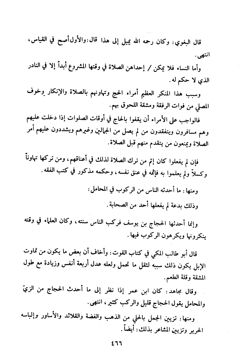 ومنها: ما أحدثه الناس من الركوب في المحامل: وذلك بدعة لم يفعلها أحد من الصحابة.