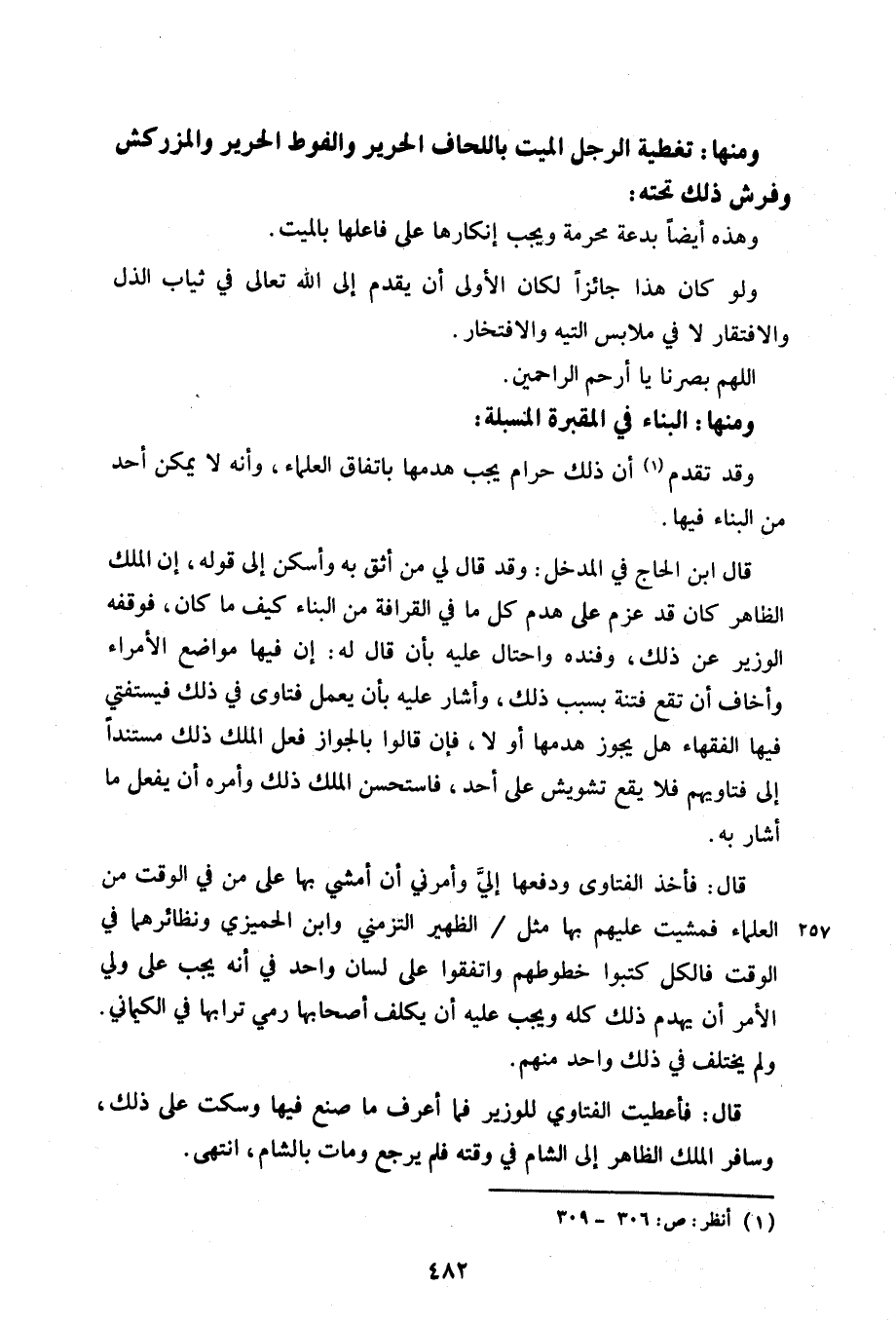 قال ابن الحاج في المدخل: وقد قال لي من أثق به وأسكن إلى قوله، إن الملك الظاهر كان قد عزم على هدم كل ما في القرافة من البناء كيف ما كان، فوقفه الوزير عن ذلك، وفنده واحتال عليه بأن قال له: إن فيها مواضع الأمراء وأخاف أن تقع فتنة بسبب ذلك، وأشار عليه بأن يعمل فتاوى في ذلك فيستفتي فيها الفقهاء هل يجوز هدمها أو لا، فإن قالوا بالجواز فعل الملك ذلك مستندًا إلى فتاويهم فلا يقع تشويش على أحد، فاستحسن الملك ذلك وأمره أن يفعل ما أشار به.