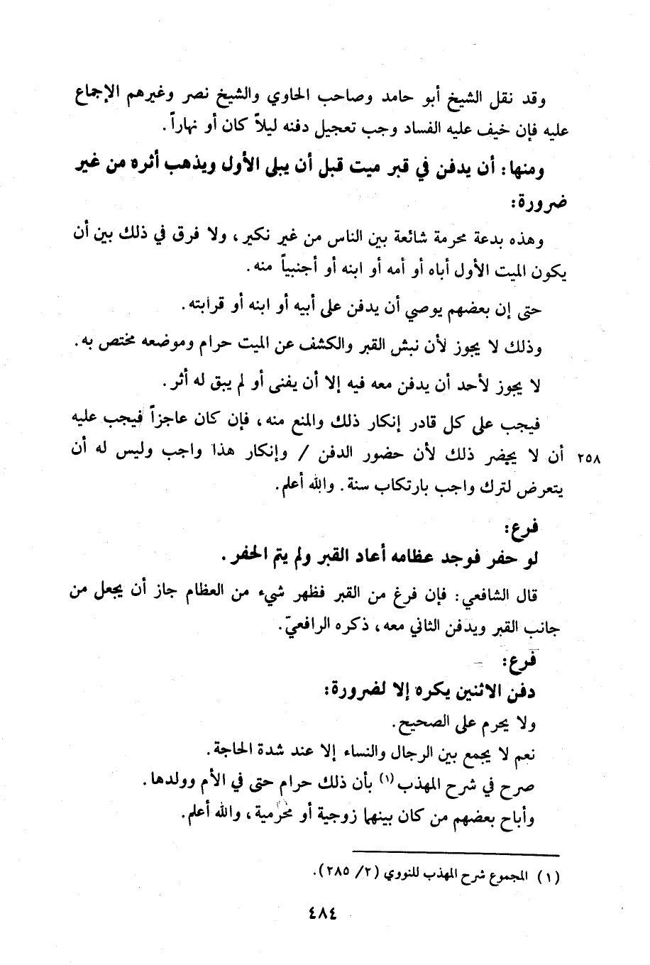 ومنها: أن يدفن في قبر ميت قبل أن يبلى الأول ويذهب أثره من غير ضرورة: