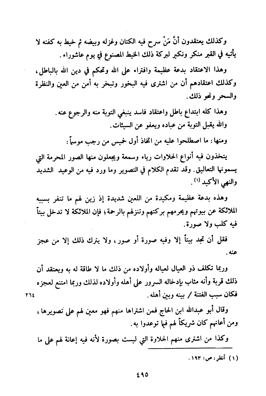 وهذه بدعة عظيمة ومكيدة من اللعين شديدة إذ زين لهم ما تنفر بسببه الملائكة عن بيوتهم ويحرمهم بركتهم وتنزلهم بالرحمة؛ فإن الملائكة لا تدخل بيتاً فيه كلب ولا صورة.