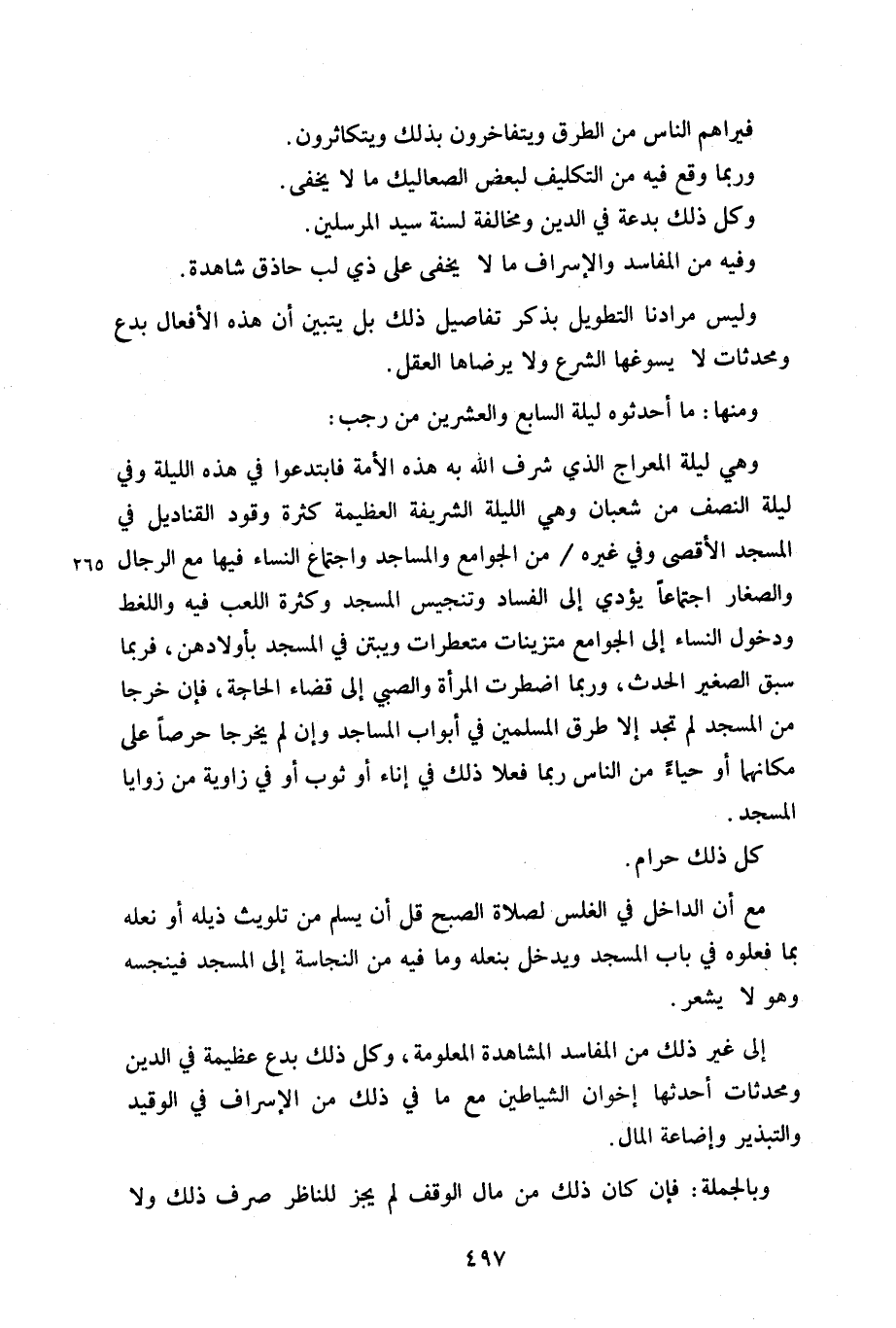 وهي ليلة المعراج الذي شرف الله به هذه الأمة فابتدعوا في هذه الليلة وفي ليلة النصف من شعبان وهي الليلة الشريفة العظيمة كثرة وقود القناديل في المسجد الأقصى وفي غيره/ من الجوامع والمساجد واجتماع النساء فيها مع الرجال 265 والصغار اجتماعاً يؤدي إلى الفساد وتنجيس المسجد وكثرة اللعب فيه واللغط ودخول النساء إلى الجوامع متزينات متعطرات ويبتن في المسجد بأولادهن، فربما سبق الصغير الحدث، وربما اضطرت المرأة والصبي إلى قضاء الحاجة، فإن خرجا من المسجد لم تجد إلا طرق المسلمين في أبواب المساجد وإن لم يخرجا حرصاً على مكانهما أو حياءً من الناس ربما فعلا ذلك في إناء أو ثوب أو في زاوية من زوايا المسجد.