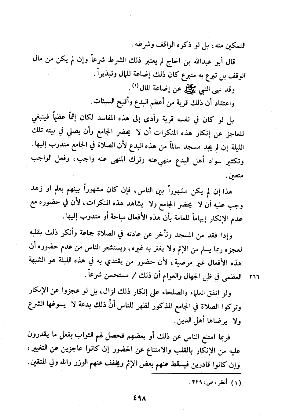 وإذا فقد من المسجد وتأخر عن عادته في الصلاة جماعة وأنكر ذلك بقلبه لعجزه ربما يسلم من الإثم ولا يغتر به غيره، ويستشعر الناس من عدم حضوره أن هذه الأفعال غير مرضية، لأن حضور من يقتدي به في هذه الليلة هو الشبهة 266 العظمى في ظن الجهال والعوام أن ذلك/ مستحسن شرعاً.