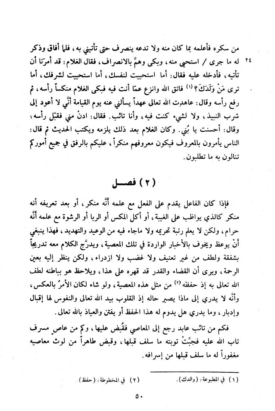 من سكره فأعلمه بما كان منه ولا تدعه ينصرف حتى تأتيني به، فلما أفاق وذكر له ما جرى / استحي منه، وبكى وهمَّ بالانصراف، فقال الغلام: قد أمرنا أن تأتيه، فأدخله عليه فقال: أما استحييت لنفسك، أما استحييت لشرفك، أما ترى من ولدك؟ فاتق الله وانزع عما أنت فيه فبكى الغلام منكساً رأسه، ثم رفع رأسه وقال: عاهدت الله تعالى عهداً يسألني عنه يوم القيامة أنَّي لا أعود إلى شرب النبيذ، ولا لشيء كنت فيه، وأنا تائب. فقال: ادن مني فقبّل رأسه؛ وقال: أحسنت يا بني. وكان الغلام بعد ذلك يلزمه ويكتب الحديث ثم قال: الناس يأمرون بالمعروف فيكون معروفهم منكراً، عليكم بالرفق في جميع أموركم تنالون به ما تطلبون.