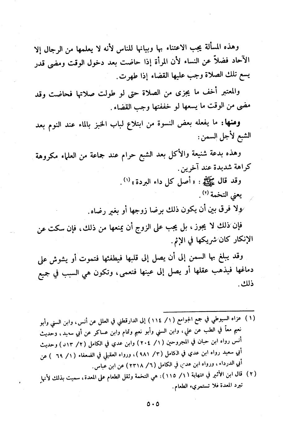 وقد يبلغ بها السمن إلى أن يصل إلى قلبها فيطفئها فتموت أو يشوش على دماغها فيذهب عقلها أو يصل إلى عينها فتعمى، وتكون هي السبب في جميع ذلك.