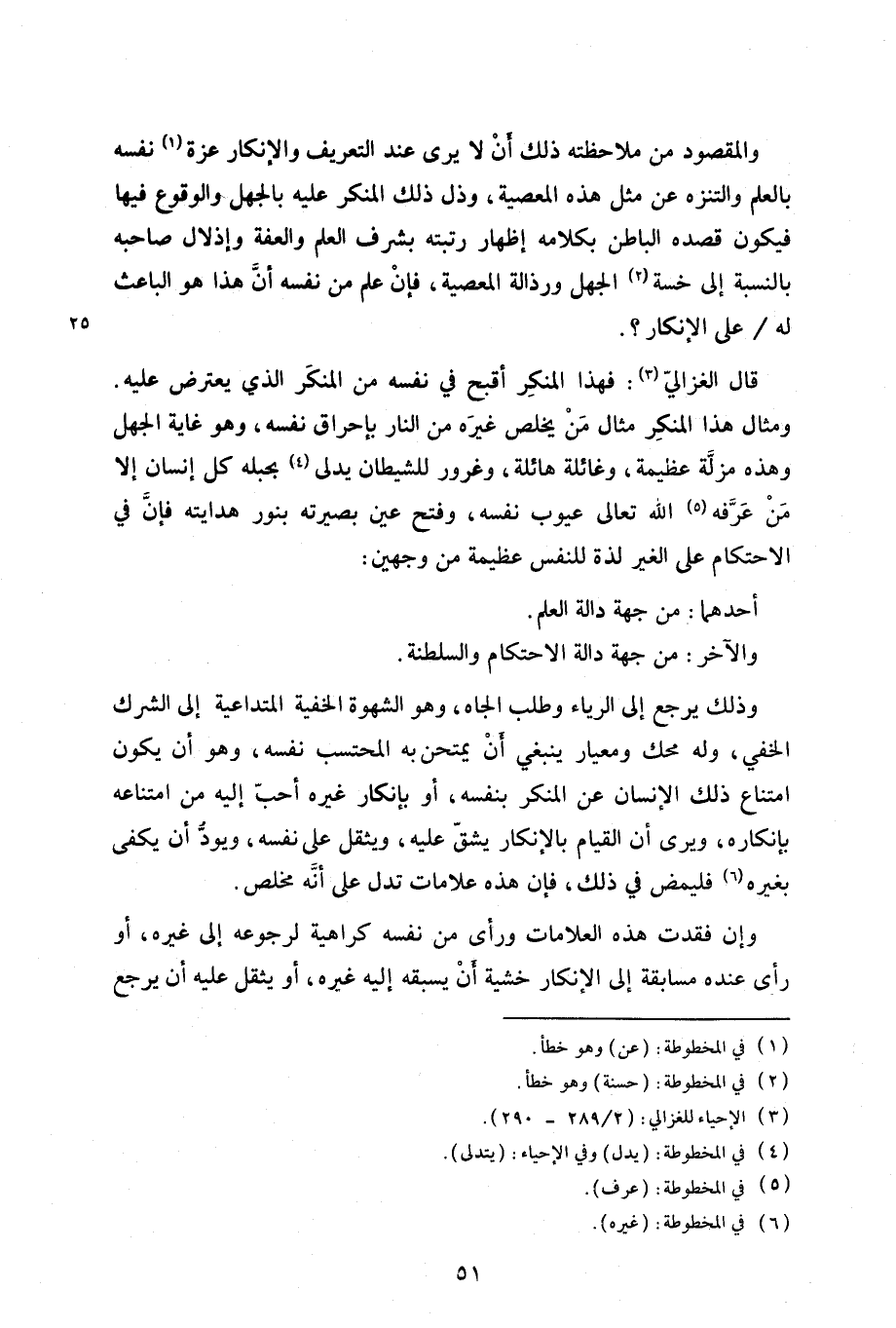 والمقصود من ملاحظته ذلك أن لا يرى عند التعريف والإنكار عزة نفسه بالعلم والتنزه عن مثل هذه المعصية، وذل ذلك المنكر عليه بالجهل والوقوع فيها فيكون قصده الباطن بكلامه إظهار رتبته بشرف العلم والعفة وإذلال صاحبه بالنسبة إلى خسة الجهل ورذالة المعصية، فإن علم من نفسه أن هذا هو الباعث له / على الإنكار؟ .