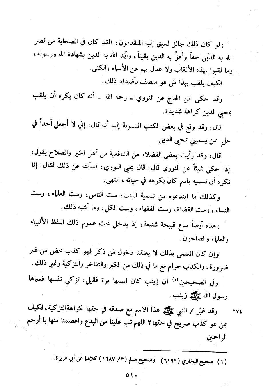 وقد حكى ابن الحاج عن النووي –رحمه الله- أنه كان يكره أن يلقب بمحيي الدين كراهة شديدة.