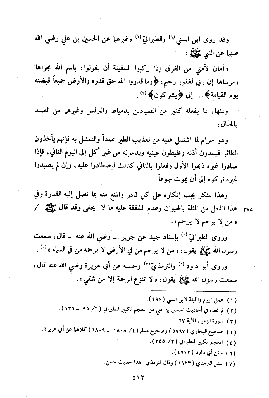 وروى الطبرانيّ بإسناد جيد عن جرير –رضي الله عنه- قال: سمعت رسول الله صلى الله عليه وسلم يقول: «من لا يرحم من في الأرض لا يرحمه من في السماء».