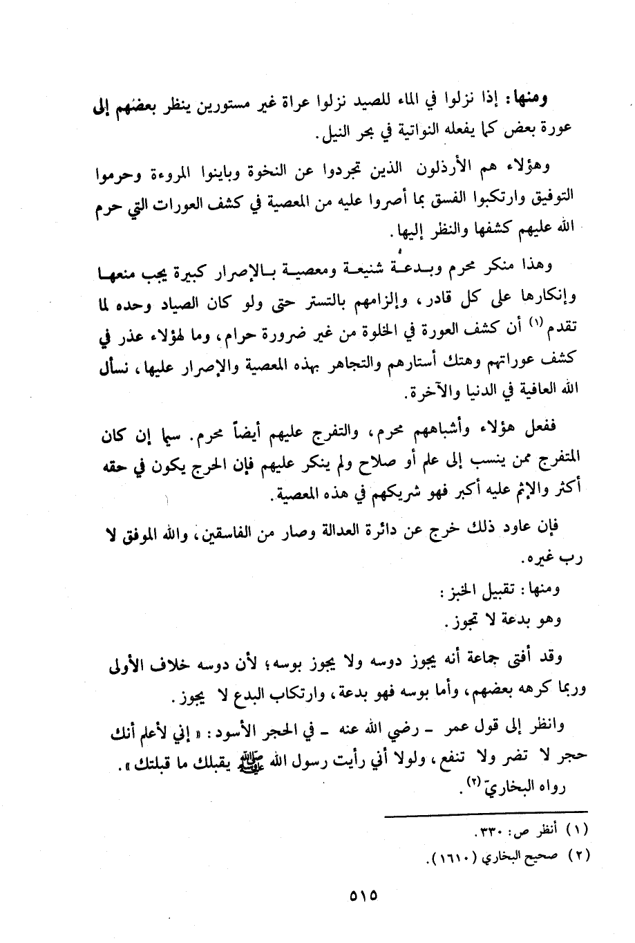ومنها: إذا نزلوا في الماء للصيد نزلوا عراة غير مستورين ينظر بعضهم إلى عورة بعض كما يفعل النواتية في بحر النيل.
