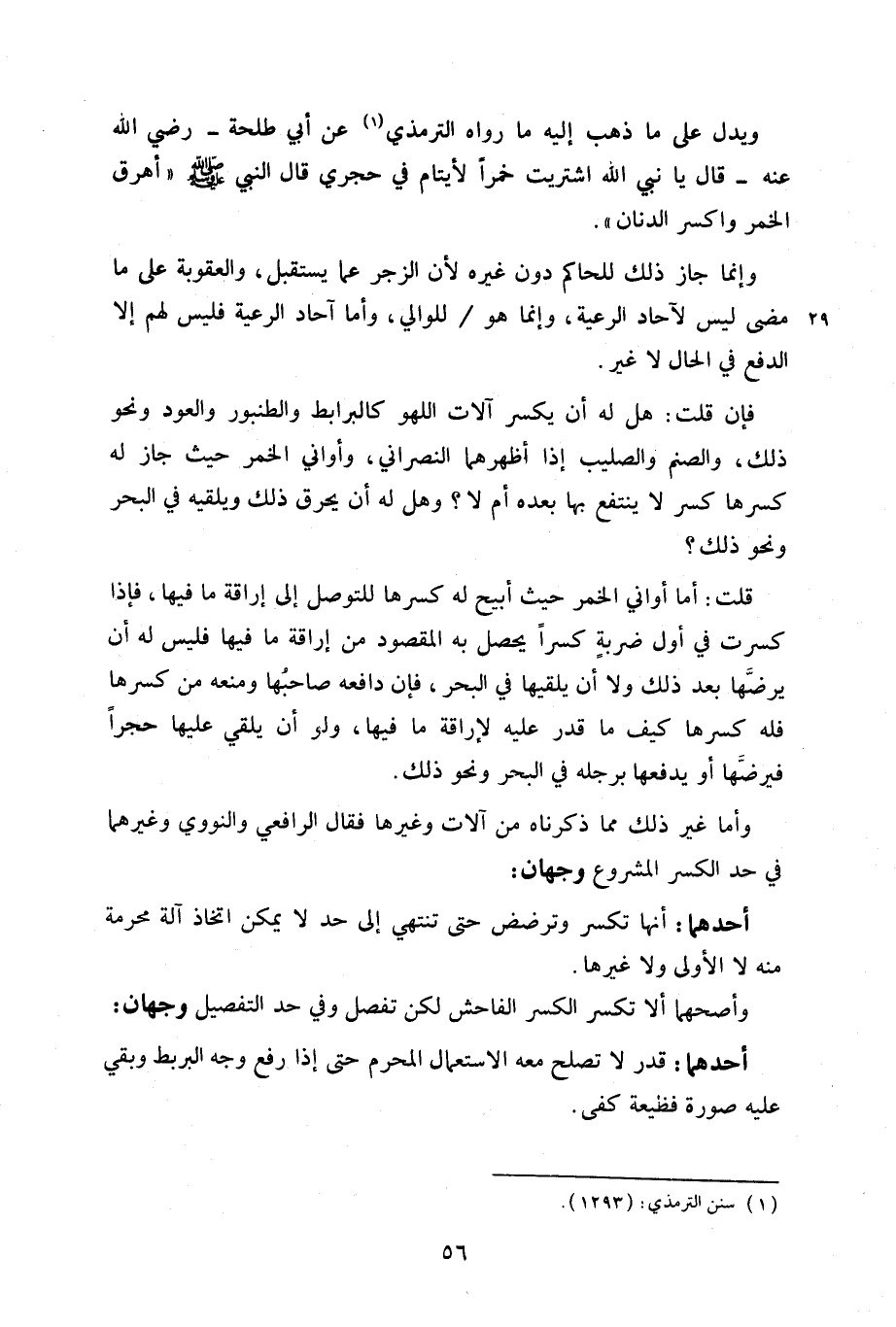 ويدل على ما ذهب إليه ما رواه الترمذي عن أبي طلحة - رضي الله عنه - قال يا نبي الله اشتريت خمراً لأيتام في حجري قال النبي صلى الله عليه وسلم «أهرق الخمر واكسر الدنان».