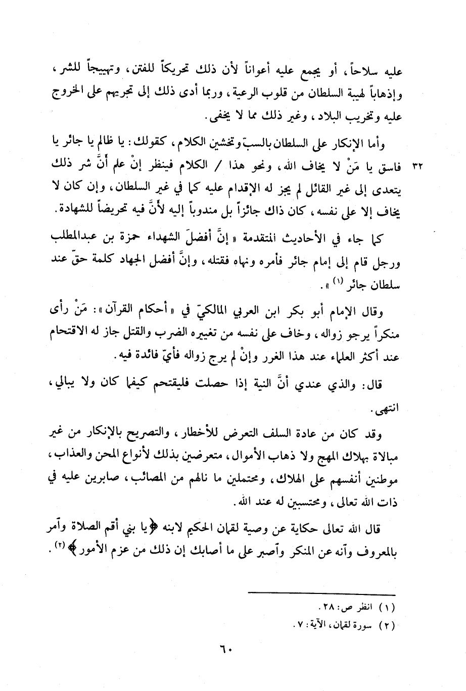 عليه سلاحاً، أو يجمع عليه أعواناً لأن ذلك تحريكاً للفتن، وتهييجاً للشر، وإذهاباً لهيبة السلطان من قلوب الرعية، وربما أدى إلى تجريهم على الخروج عليه وتخريب البلاد، وغير ذلك مما لا يخفى.