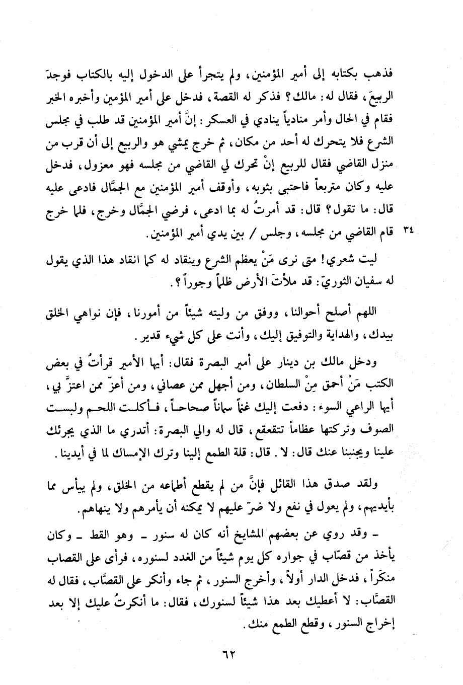 ودخل مالك بن دينار على أمير البصرة فقال: أيها الأمير قرأت في بعض الكتب من أحق من السلطان، ومن أجهل ممن عصاني، ومن أعز ممن اعتز بي، أيها الراعي السوء: دفعت إليك غنماً سماناً صحاحاً، فأكلت اللحم ولبست الصوف وتركتها عظاماً تتقعقع، قال له والي البصرة: أتدري ما الذي يجرئك علينا ويجنبنا عنك قال: لا. قال: قلة الطمع إلينا وترك الإمساك لما في أيدينا.
