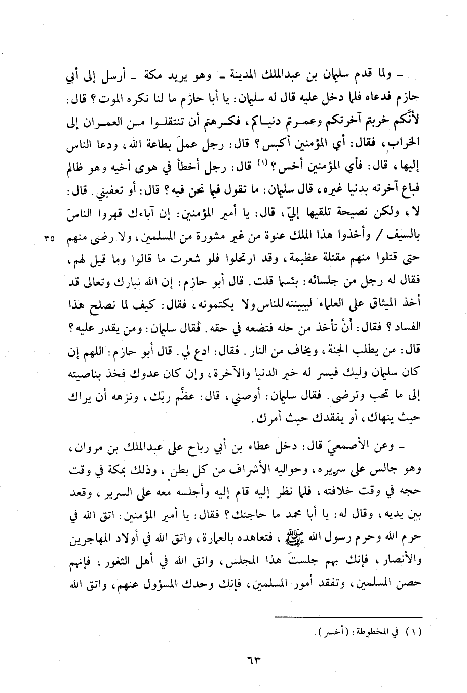 - ولما قدم سليمان بن عبد الملك المدينة - وهو يريد مكة - أرسل إلى أبي حازم فدعاه فلما دخل عليه قال له سليمان: يا أبا حازم ما لنا نكره الموت؟ قال: لأنكم خربتم آخرتكم وعمرتم دنياكم، فكرهتم أن تنتقلوا من العمران إلى الخراب، فقال: أي المؤمنين أكبس؟ قال: رجل عمل بطاعة الله، ودعا الناس إليها، قال: فأي المؤمنين أخس؟ قال: رجل أخطأ قي هوى أخيه وهو ظالم فباع آخرته بدنيا غيره، قال سليمان: ما تقول فيما نحن فيه؟ قال: أو تعفيني. قال: لا، ولكن نصيحة تلقيها إليّ، قال: يا أمير المؤمنين: إن آباءك قهروا الناس بالسيف / وأخذوا هذا الملك عنوة من غير مشورة من المسلمين، ولا رضى منهم حتى قتلوا منهم مقتلة عظيمة، وقد ارتحلوا فلو شعرت ما قالوا وما قيل لهم، فقال له رجل من جلسائه: بئسما قلت. قال أبو حازم: إن الله تبارك وتعالى قد أخذ الميثاق على العلماء ليبيننه للناس ولا يكتمونه، فقال: كيف لا نصلح هذا الفساد؟ فقال: أن تأخذ من حله فتضعه في حقه. فقال سليمان: ومن يقدر عليه؟ قال: من يطلب الجنة، ويخاف من النار. فقال: ادع لي. قال أبو حازم: اللهم إن كان سليمان وليك فيسر له خير الدنيا والآخرة، وإن كان عدوك فخذ بناصيته إلى ما تحب وترضى. فقال سليمان: أوصني، قال: عظم ربك، ونزهه أن يراك حيث ينهاك، أو يفقدك حيث أمرك.