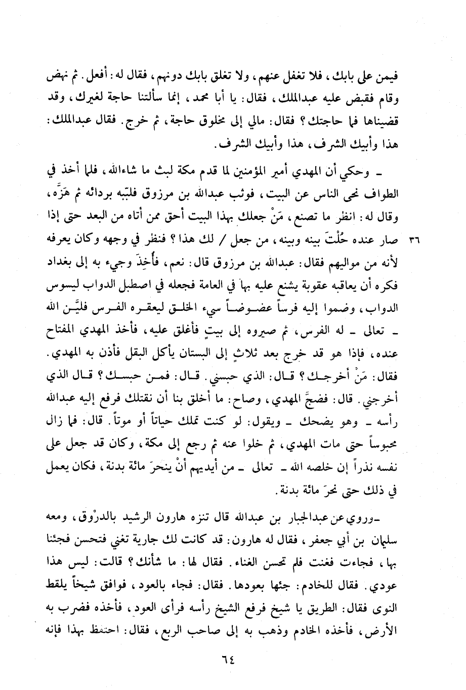 - وحكي أن المهدي أمير المؤمنين لما قدم مكة لبث ما شاء الله، فلما أخذ في الطواف نحي الناس عن البيت، فوثب عبد الله بن مرزوق فلبّبه بردائه ثم هزّه، وقال له: انظر ما تصنع، مَنْ جعلك بهذا البيت أحق ممن أتاه من البعد حتى إذا صار عنده حلت بينه وبينه، من جعل / لك هذا؟ فنظر في وجهه وكان يعرفه لأنه من مواليهم فقال: عبد الله بن مرزوق قال: نعم، فأخذ وجيء به إلى بغداد فكره أن يعاقبه عقوبة يشنع عليه بها في العامة فجعله في اصطبل الدواب ليسوس الدواب، وضموا إليه فرساً عضوضاً سيء الخلق ليعقره الفرس فليّن الله - تعالى - له الفرس، ثم صيروه إلى بيت فأغلق عليه، فأخذ المهدي المفتاح عنده، فإذا هو قد خرج بعد ثلاث إلى البستان يأكل البقل فأذن به المهدي فقال: من أخرجك؟ قال: الذي حبسني. قال: فمن حبسك؟ قال الذي أخرجني. قال: فضج المهدي، وصاح: ما أخلق بنا أن نقتلك فرفع إليه عبد الله رأسه - وهو يضحك - ويقول: لو كنت تملك حياتاً أو موتاً. قال: فما زال محبوساً حتى مات المهدي، ثم خلوا عنه ثم رجع إلى مكة، وكان قد جعل على نفسه نذراً إن خلصه الله - تعالى - من أيديهم أن ينحر مائة بدنة، فكان يعمل في ذلك حتى نحر مائة بدنة.
