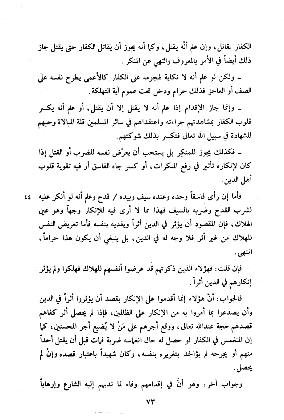 - وإنما جاز الإقدام إذا علم أنه لا يقتل إلا أن يقتل، أو علم أنه يكسر قلوب الكفار بمشاهدتهم جراءته واعتقداهم في سائر المسلمين قلة المبالاة وحبهم للشهادة في سبيل الله تعالى فتكسر بذلك شوكتهم.