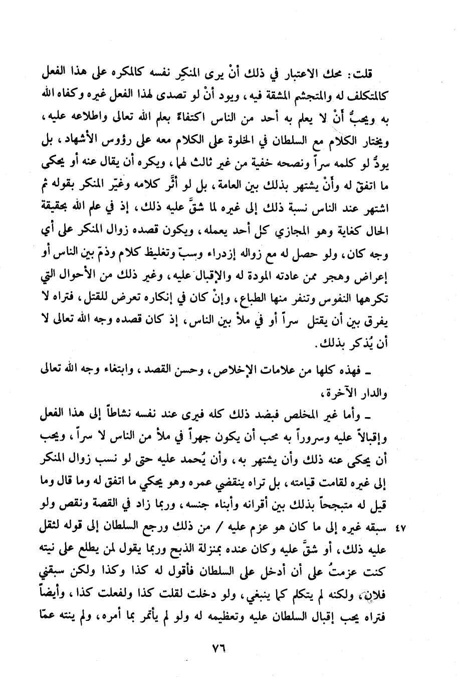 - وأما غير المخلص فبضد ذلك كله فيرى عند نفسه نشاطاً إلى هذا الفعل وإقبالاً عليه وسروراً به محب أن يكون جهراً في ملأ من الناس لا سراً، ويحب أن يحكى عنه ذلك وأن يشتهر به، وأن يُحمد عليه حتى لو نسب زوال المنكر إلى غيره لقامت قيامته، بل تراه ينقضي عمره وهو يحكي ما اتفق له وما قال وما قيل له متبجحاً بذلك بين أقرانه وأبناء جنسه، وربما زاد في القصة ونقص ولو سبقه غيره إلى ما كان هو عزم عليه/ من ذلك ورجع السلطان إلى قوله لثقل عليه ذلك، أو شق عليه وكان عنده بمنزلة الذبح وربما يقول لمن يطلع على نيته كنت عزمتُ على أن أدخل على السلطان فأقول له كذا وكذا ولكن سبقني فلان، ولكنه لم يتكلم كما ينبغي، ولو دخلت لقلت كذا ولفعلت كذا، وأيضاً فتراه يحب إقبال السلطان عليه وتعظيمه له ولو لم يأتمر بما أمره، ولم ينته عما