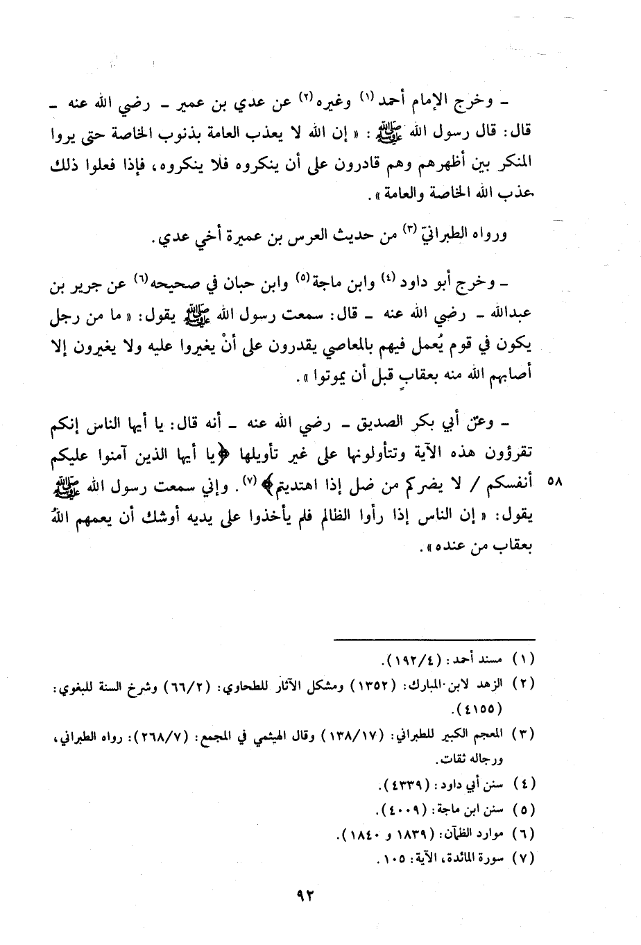 وخرج الإمام أحمد وغيره عن عدي بن عمير –رضي الله عنه- قال: قال رسول الله صلى الله عليه وسلم: «إن الله لا يعذب العامة بذنوب الخاصة حتى يروا المنكر بين أظهرهم وهم قادرون على أن ينكروه فلا ينكروه، فإذا فعلوا ذلك عذب الله الخاصة والعامة».