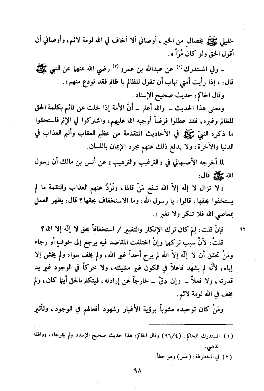 فإن قلت: لم كان ترك الإنكار والتغيير/ استخفافًا بحق لا إله إلا الله؟ قلت: لأن سبب تركهما وإن اختلفت المقاصد فيه يرجع إلى خوف أو رجاء ومن تحقق أن لا إله إلا الله لم يرج أحدًا غير الله، ولم يخف سواه ولم يخش إلا إياه، لأنه لم يشهد فاعلًا في الكون غير مشيئته، ولا محركًا في الوجود غير يد قدرته، ولا فعلًا –وإن دق- خارجًا عن إرادته، فيتكلم بالحق أينما كان، ولم يخف في الله لومة لائم.