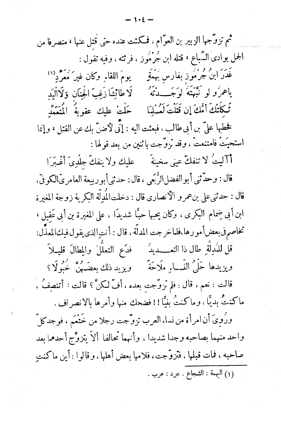 قالت: نعم. قال: فلِم تزوّجت بعده؟ أفٍّ لكنّ! قالت: أتنصف ما كنتُ بديّاً، وما بَنيّاً! فضحك منها وأمرها بالانصراف.