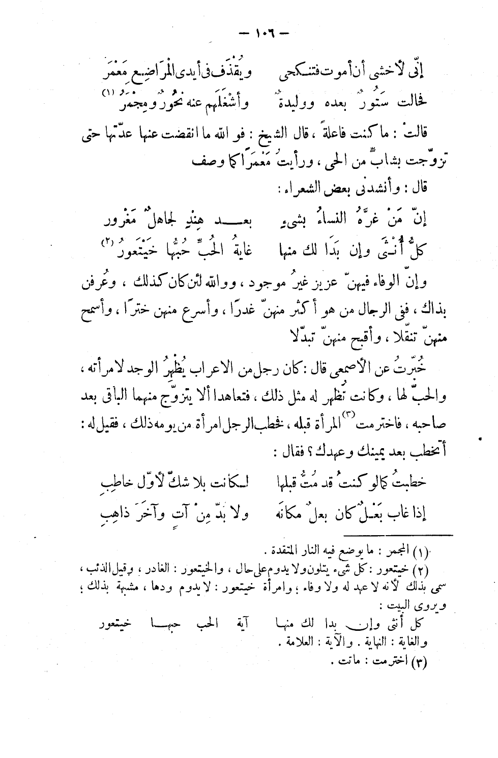 وإن الوفاء فيهن عَزيز، وغير موجود، ووالله لئن كان كذاك وعُرفن بذاك، ففي الرجال من هو أكثر منهن غدراً، وأسرع منهن خَتراً، وأسمح منهن تنقّلاً، وأقبح منهن تبدُّلاً.