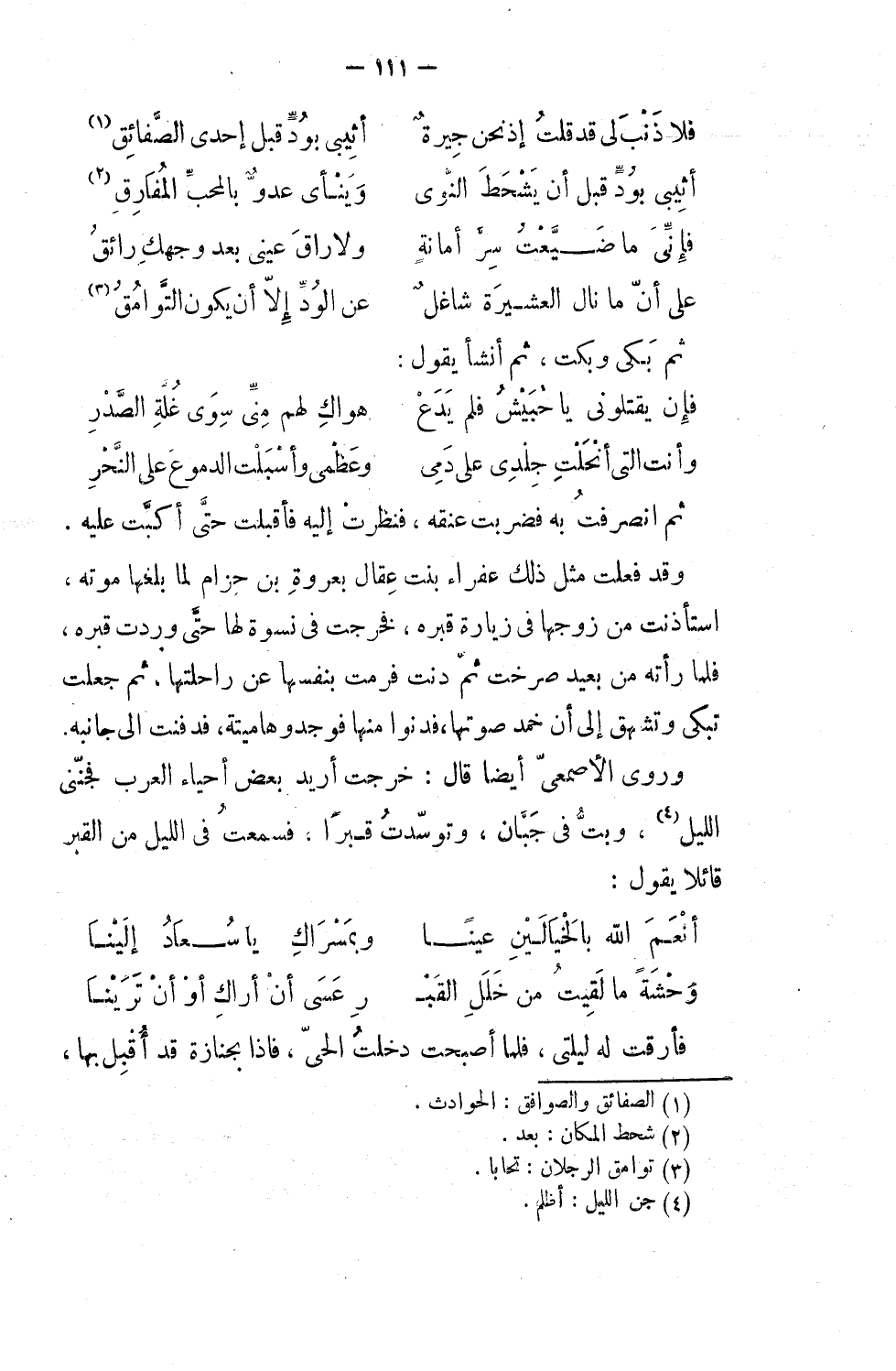 وروى الأصمعي أيضاً قال: حرجتُ أريد بعض أحياء العرب، فجنّتي الليل، وبتّ في جَبّان، وتوسّدتُ قبراً، فسمعت في الليل من القبر قائلاً يقول: