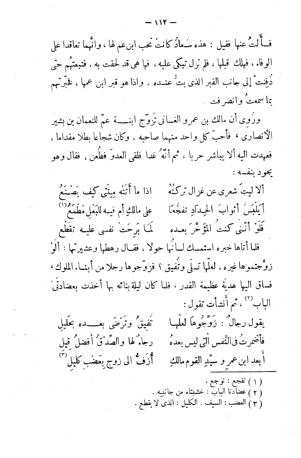 فسألت عنها، فقيل: هذه سعاد كانت تحبّ ابن عمٍّ لها، وإنهما تعاقدا على الوفاء فهلك قبلها، فلم تزل تبكي عليه، فها هي قد لحقت به. فتبعتُهُم، حتى دُفنت إلى جانب القبر الذي بِتُّ عنده، وإذا هو قبر ابن همها، فخبّرتهم بما سمعتُ وانصرفت.