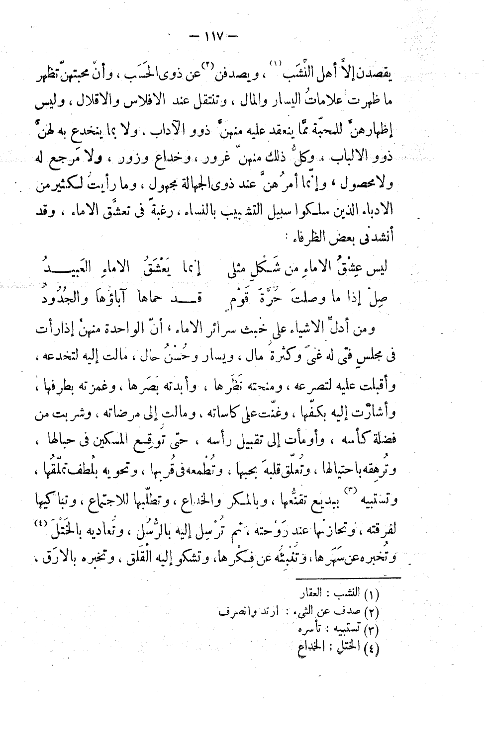 يقصدن إلا أهل النشث، ويُصدُفن عن ذوي الحسب، وأن محبّتهن تظهر ما ظهرت علامات اليسار والمال، وتنتقل عند الإفلاس والإقلال. وليس إظهارهن للمحبة مما ينعقد عليه منهن ذوو الآداب، ولا بما ينخدع به لهن ذوو الألباب. وكل ذلك منهن غرورٌ، وخداع وزور، ولا مرجع له ولا محصول، وإنما أمرهنّ عند ذوي الجهالة مجهول. وما رأيت لكثيرٍ من الأدباء الذين سلكوا سبيل التشبيث بالنساء، رغبةً في تعشُّق الإماء، وقد أنشدني بعض الظرفاء: