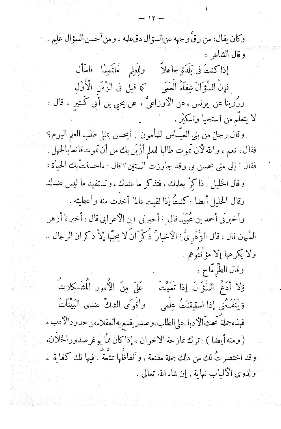 وروينا عن يونس عن الأوزاعي عن يحيى بن أبي كثير قال: لا يتعلم من استحيا وتكبر. وقال رجل من بني العباس للمأمون: أيحسن بمثلي العلم اليوم؟ فقال: نعم والله لأن تموت طالباً للعلم أزين بك من أن تموت قانعاً بالجهل. فقال: إلى متى يحسن بي، وقد جاوزت الستين! قال: ما حسنت بك الحياة. وقال الخليل: ذاكر بعلمك فتذكر ما عندك وتستفيد ما ليس عندك. وقال الخليل أيضاً: كنت إذا لقيت عالماً أخذت منه وأعطيته. وأخبرني أحمد بن عبيد قال: أخبرني ابن الأعرابي قال: أخبرنا أزهر السمان قال: قال الزهري: الأخبار ذكران لا يحبها إلا ذكران الرجال، ولا يكرهها إلا مؤنثوهم. وقال الطرماح: