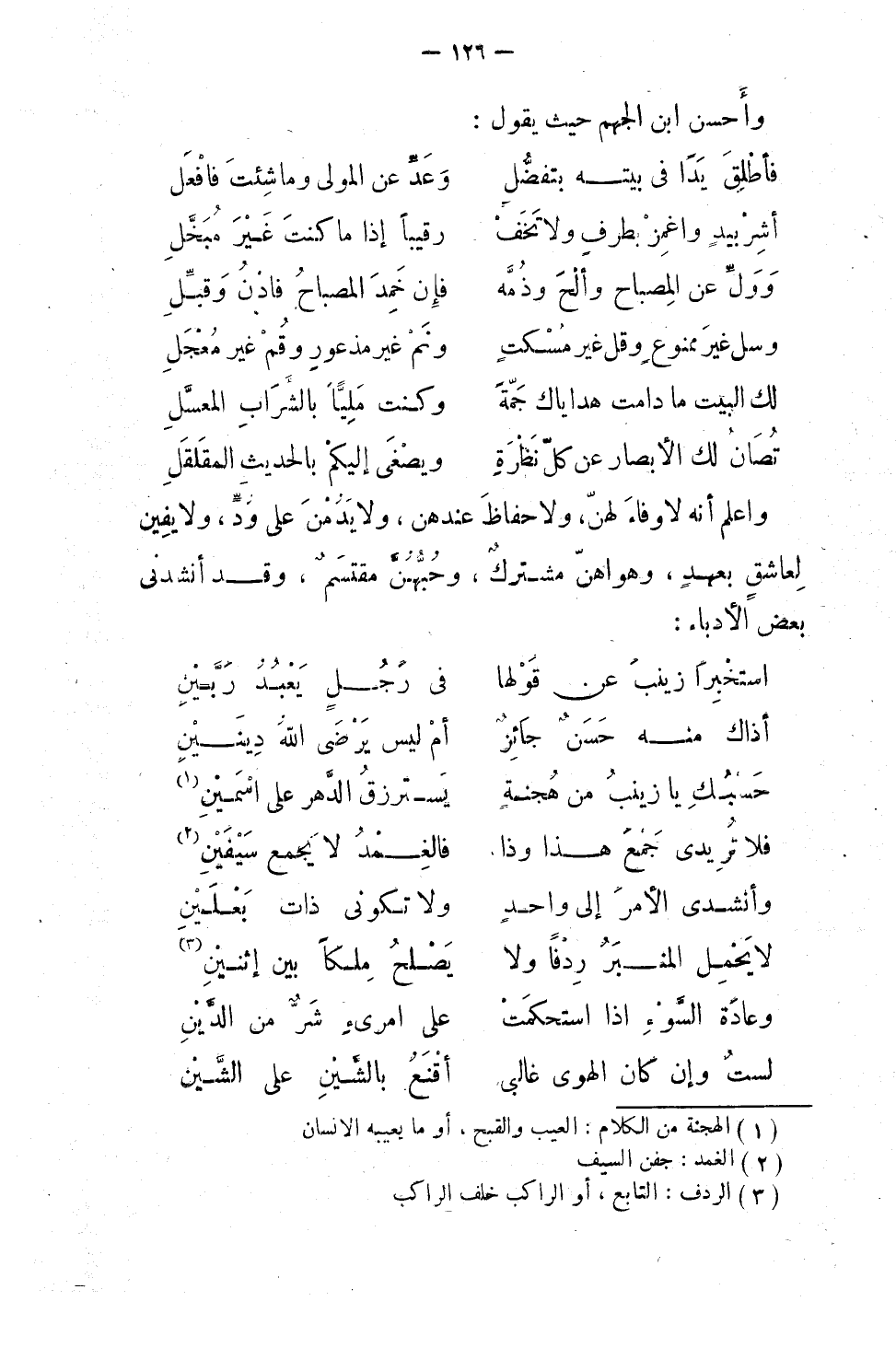 واعلم أنه لا وفاء لهن، ولا حفاظ عندهن، ولا يدُ من على ودّ، ولا يفينَ لعاشقٍ بعهد، وهواهن مشتركٌ، وحبهن مقتسَمُ. وقد أنشدني بعض الأدباء: