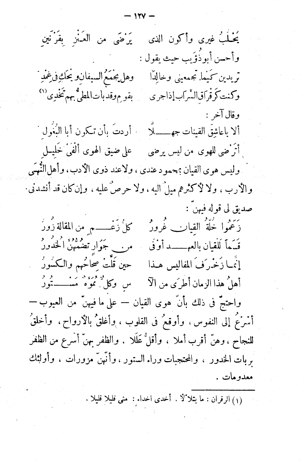 ولي سهوى القيان بمحمودٍ عندي، ولا عند ذوي الأدب، وأهل النُّهى والأرَب، ولا لأكثرهم ميلٌ إليه، ولا حرصٌ عليه، وإن كان قد أنشدني صديقٌ لي قوله فيهن: