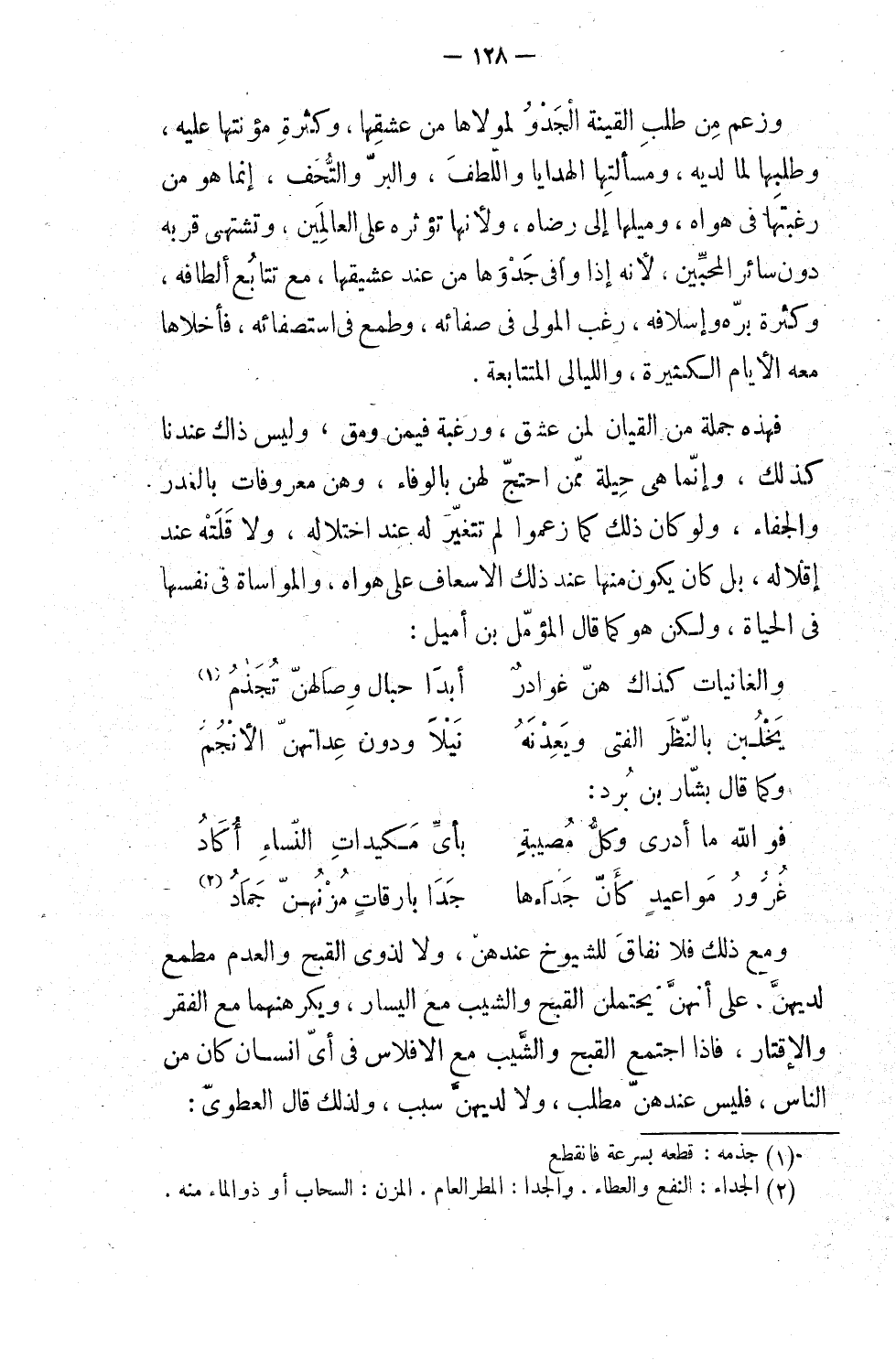 وزعم من طلب القينة الجَدْوَ لمولاها من عشقها وكثرة مؤونتها عليه، وطلبها لِما لديه ومسألتها الهدايا، واللُّطَفَ، والبرّ، والتحف، إنما هو من رغبتها في هواه، وميلها إلى رضاه، ولأنها تؤثره على العالمين، وتشتهي قربه دون سائر المحبين، لأنه إذا وافى جدوها من عند عشيقها مع تتابع ألطافه، وكثرة برّه وإسلافه، رغب المولى في صفائه، وطمع في استصفائه، فأخْلاها معه الأيام الكثيرة، والليالي المتتابعة؛ فهذه جملةٌ من القيان لمن عشق، ورغبةٌ فيمن ومَقَ، وليس ذاك عندنا كذلك، وإنما هي حيلة ممن احتجّ لهنّ بالوفاء، وهم معروفاتٌ بالغدر والجفاء، ولو كان ذلك كما زعموا، لم تتغير له عند اختلاله ولا قلَتْه عند إقلاله، بل كان يكون منها عند ذلك الإسعاف على هواه، والمؤاساة في نفسها في الحياة، ولكن هو كما قال المؤمَّل بن أميل: