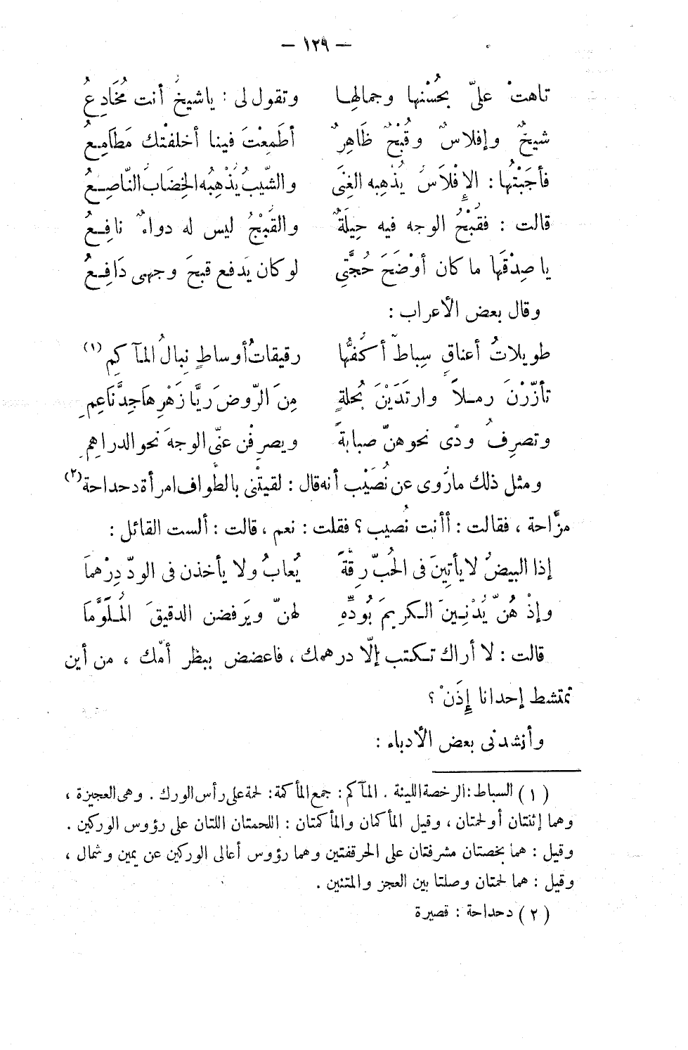 ومثل ذلك ما رُوي عن نُصَيب أنه قال: لَقيتني بالطواف امرأةٌ دَحْداحة، مزّاحة، فقالت: أأنت نُصَيب؟ فقلت: نعم! قالت: ألستَ القائل: