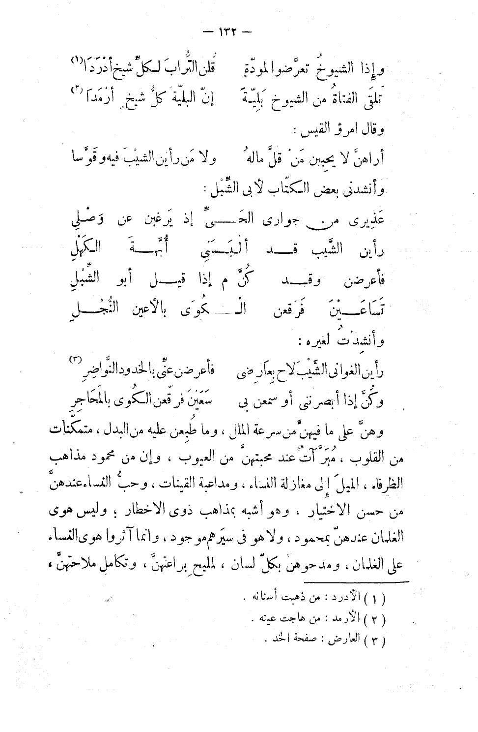 وإن من محمود مذاهب الظرفاء الميل إلى مغازلة النساء ومداعبة القينات، وحبّ النساء عندهم من حسن الاختيار، وهو أشبه بمذاهب ذوي الأخطار، وليس هوى الغِلمان عندهم بمحمودٍ، ولا هو في سيرهم موجود، وإنما آثروا هوى النساء على الغلمان، ومدحوهن بكل لسان، لمليح براعتهنّ، وتكامُل مَلاحتهن،