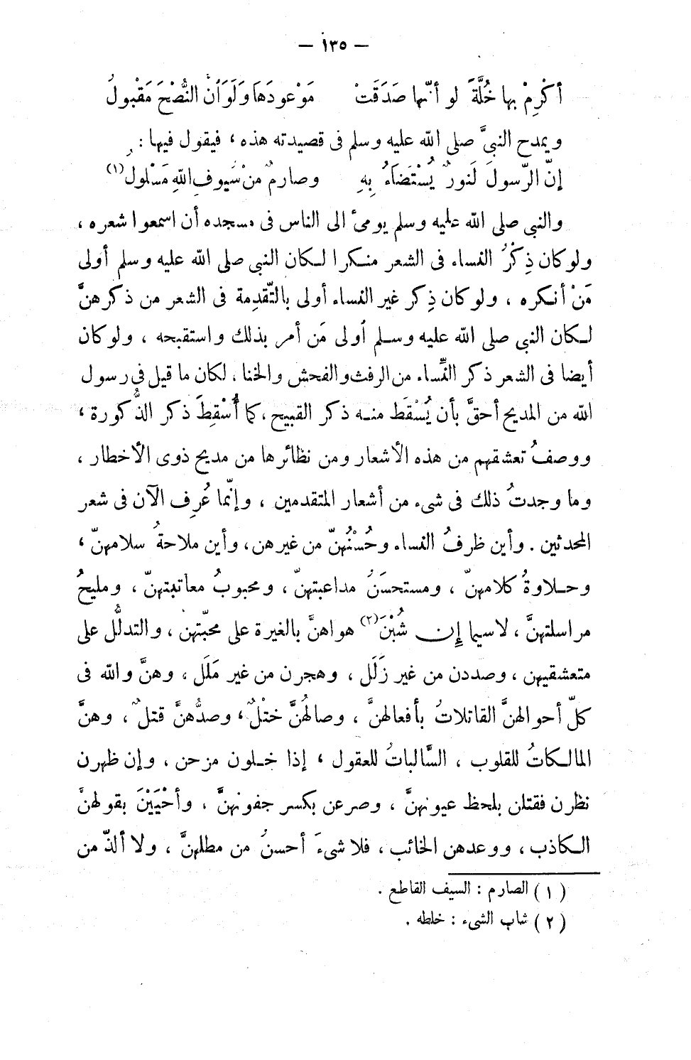 والنبي، صلى الله عليه وسلم، يومئ إلى الناس في مسجده أن اسمعوا شعره، ولو كان ذكر النساء في الشعر منكراً، لكان النبي، صلى الله عليه وسلم، أوّل من أنكره، ولو كان ذكر غير النساء أولى بالتقدمة في الشعر من ذكرهن لكان النبي، صلى الله عليه وسلم، أول من أمر بذلك واستقبحه، ولو كان أيضاً في الشعر ذكر النساء من الرفث والفُحش والخنى لكان ما قيل في رسول الله من المديح أحقّ بأن يُسقط منه ذكر القبيح كما أُسقط ذكر الذكورة ووصفُ نعشّقهم من هذه الأشعار ومن نظائرها، من مديح ذوي الأخطار، وما وجدت ذلك في شيء من أشعار المتقدّمين وإنما عُرف الآن في شعر المُحدَثين، وأين ظَرف النساء وحسنهن من غيرهنّ، وأين ملاحة سَلامهن، وحلاوة كلامهن، ومستحسن مداعبتهن، ومحبوب معاتبتهن، ومليح مراسلتهن، لا سيما إن شُبْن هواهن بالغَيرة على محبيهن، والتدلل على متعشقيهن، وصددن من غير زلل، وهجرن من غير ملل، وهنّ والله في كل أحوالهن القاتلات بأفعالهن، وصالهن خَتلٌ، وصدُّعن قتلٌ، وهن المالكات للقلوب، السالبات للعقول، إذا خلون موحْن، وإن ظهرْن نظرن، فقتلن بلحظ عيونهن، وصرعن بكسر جفونهن، وأحيين بقولهن الكاذب، ووعدهن الخائب، فلا شيء أحسن من مطْلهن، ولا ألذ من
