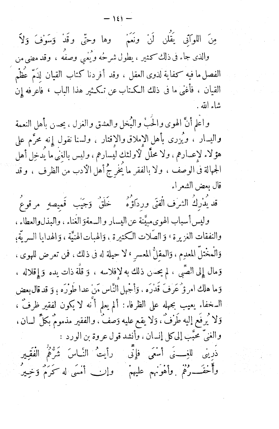 واعلم أن الهوى، والحب، والبخل، والعشق، والغزل يحسن بأهل النعمة واليَسار، ويُزري بأهل الإملاق والإقتار، ولسنا نقول إنه محرَّمٌ على هؤلاء لإعسارهم، ولا محلل لأولئك ليسارهم، وليس بالغنى ما يُدخل أهل الجهالة في الوصف، ولا بالفقر ما يُخرج أهل الأجب من الظرف، وقد قال بعض الشعراء: