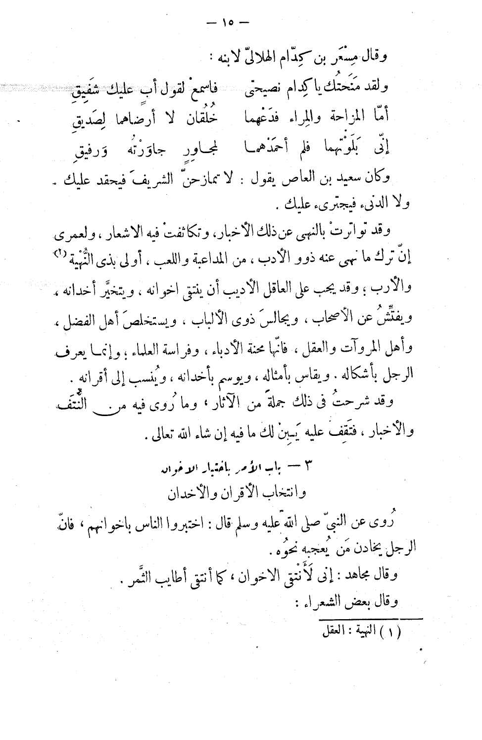وقد تواترت بالنهي عن ذلك الأخبار، وتكاثفت فيه الأشعار، ولعمري إن ترك ما نهى عنه ذوو الأدب، من المداعبة واللعب، أولى بذي النهية والأرب. وقد يجب على العاقل الأديب أن ينتقي إخوانه، ويتخير أخدانه، ويفتش عن الأصحاب، ويجالس ذوي الألباب، ويستخلص أهل الفضل، وأهل المروءات والعقل، فإنها محنة الأدباء، وفراسة العلماء، وإنما يعرف الرجل بأشكاله، ويقاس بأمثاله، ويوسم بأخدانه، وينسب إلى أقرانه. وقد شرحت في ذلك جملة من الآثار، وما روي فيه من النتف والأخبار، فقف عليه يبن لك ما فيه، إن شاء الله تعالى.