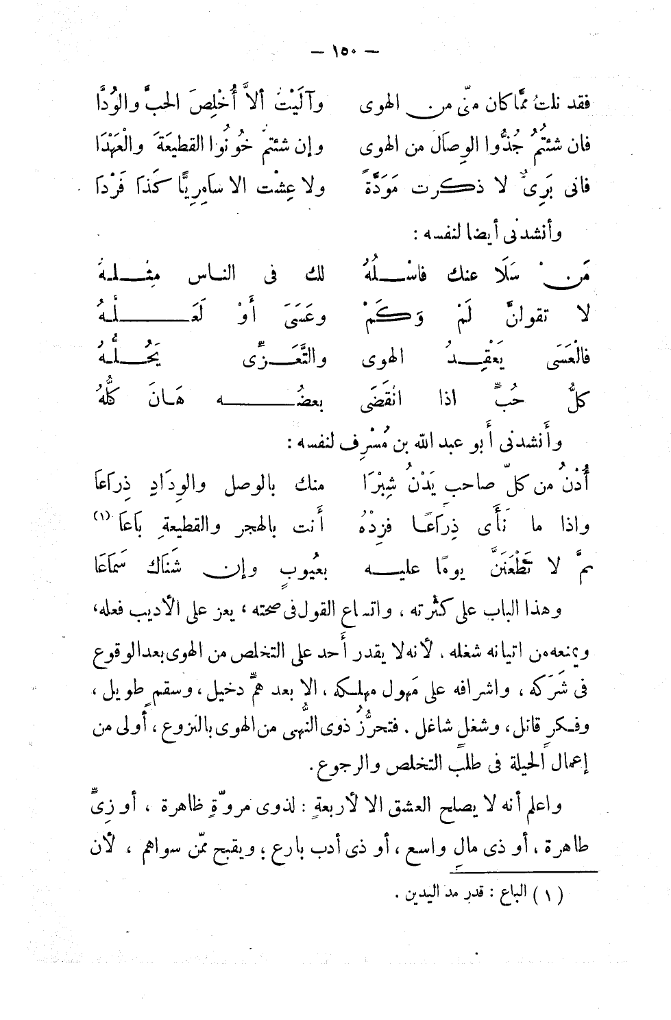 واعلم أنه لا يصلح العشق إلا لأربعةٍ: لذي مُرُوةٍ ظاهرةٍ، أو ذي طاهرةٍ، أو ذي مال وساع، أو ذي أدب بارع؛ ويقبُحُ ممن سواهم لأن