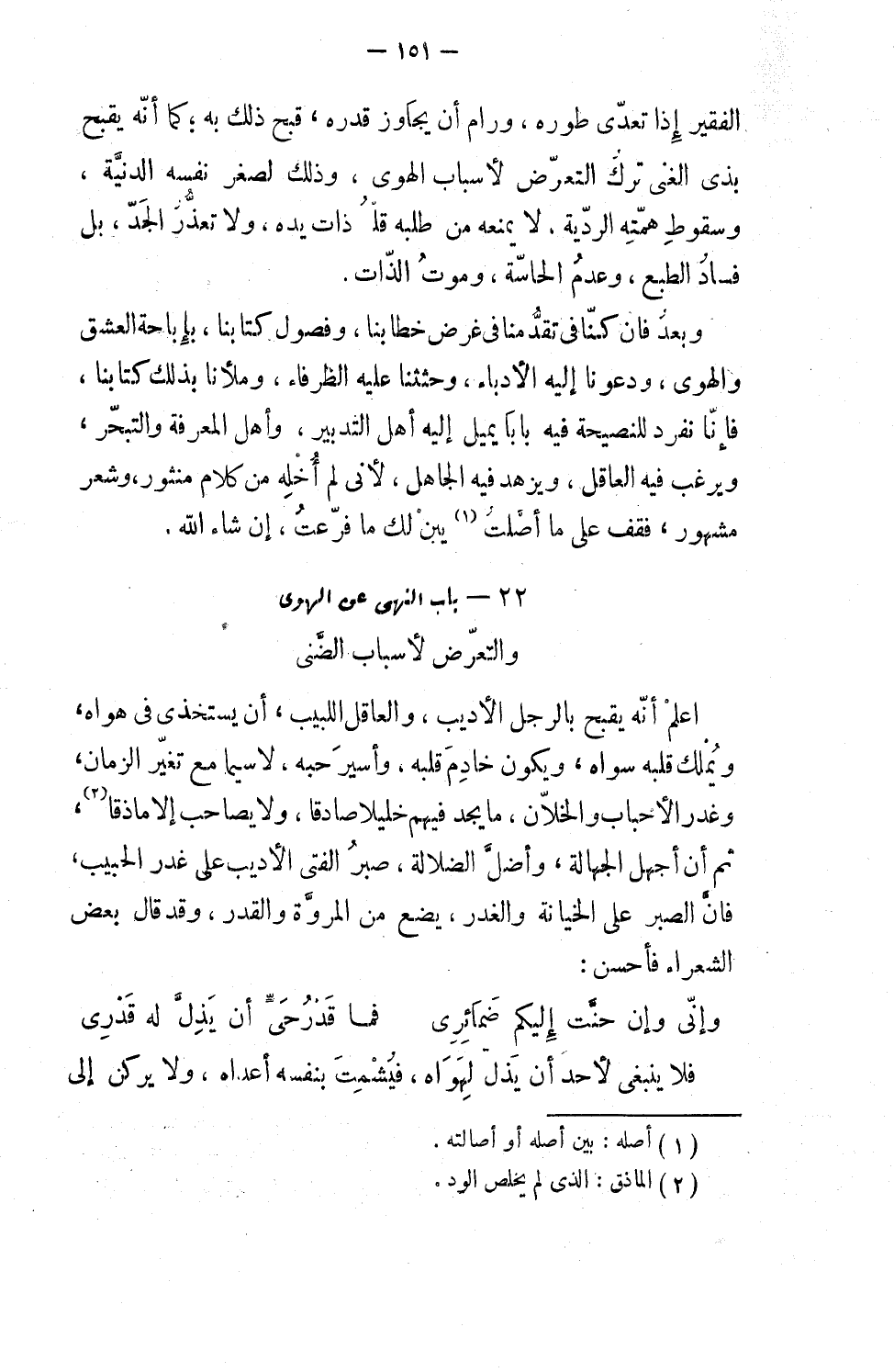 اعلم أنه يقبُح بالرجل الأديب، والعاقل اللبيب، أن يستخذي في هواه، ويُملِّك قلبه سواه، ويكون خادم قلبه، وأسير حبّه، لا سيما مع تغيُّر الزمان، وغدر الأحباب والخلاّن، ما يجد فيهم خليلاً صادقاً، ولا يصاحب إلا ماذقاً. ثم إن أجهل الجَهالة، وأضلَّ الضلالة، صبْرُ الفتى الأديب، على غدر الحبيب، فإنّ الصبر على الخيانة والغدر، يضع من المُرُوّة والقدْر؛ وقد قال بعض الشعراء فأحسن: