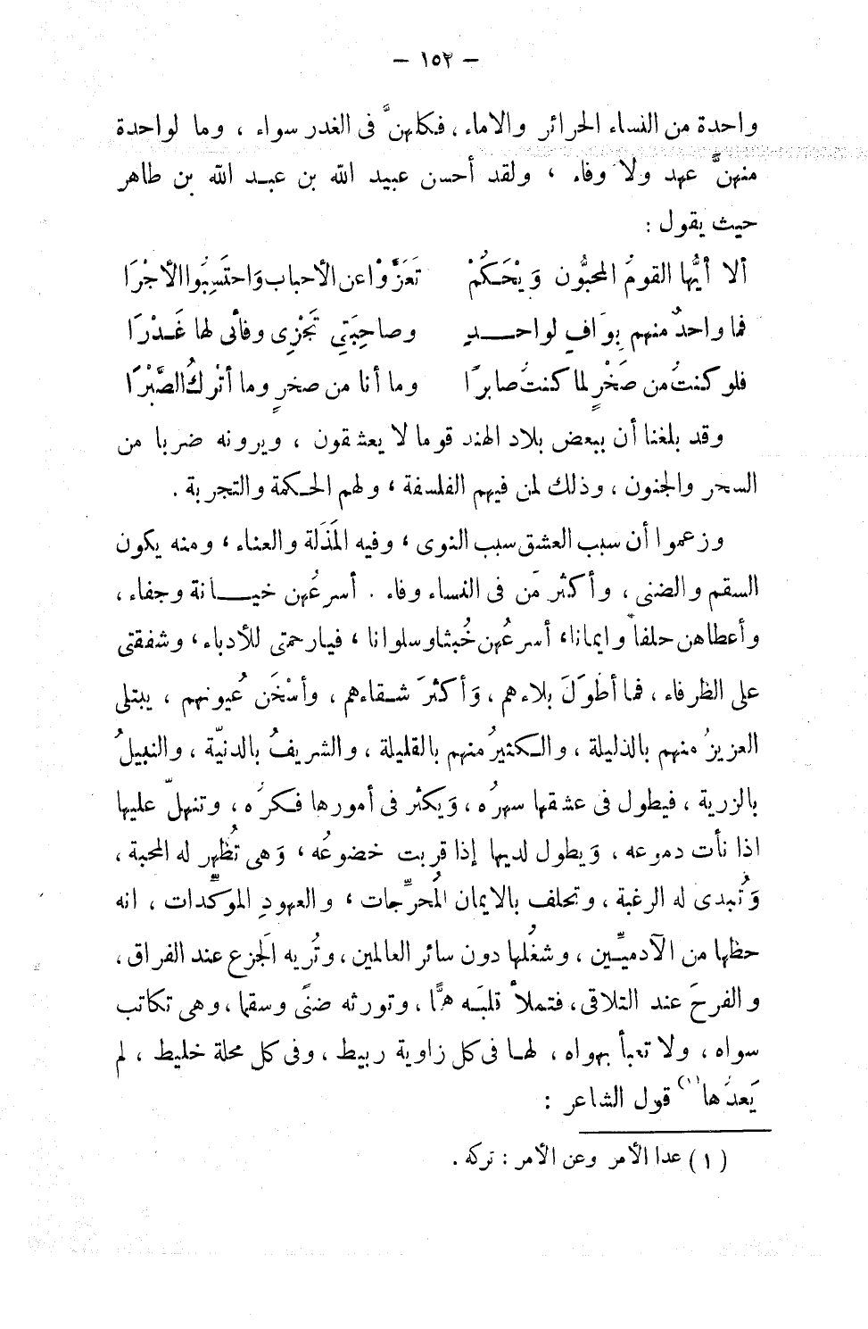 واحدةٍ من النساء الحرائر والإماء، فكلّهن في الغدر سواء، وما لواحدة منهن عهد ولا وفاء؛ ولقد أحسن عُبيد الله بن عبد الله بن طاهر حيث يقول: