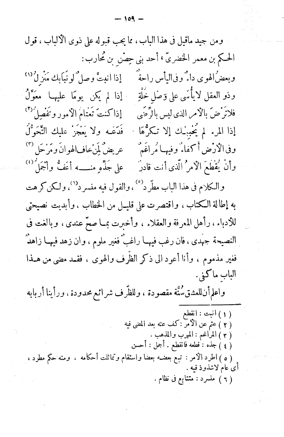 والكلام في هذا الباب مطّرِد، والقول فيه منسَرِد، ولكن كرهتُ به إطالة الكتاب، واقتصرت على قليل من الخِطاب، وأبديتُ نصيحتي للأدباء، وأهل المعرفة والعقلاء، وأخبرت بما صحّ عندي، وبالغتَ في النصيحة جُهدي، فإن رغب فيها اغبٌ فغير مَلوم، وإن زهد فيها زاهد فغير مَذْموم. وأنا أعود إلى ذكر الظَّرف والهوى، فقد مضى من هذا الباب ما كفى.