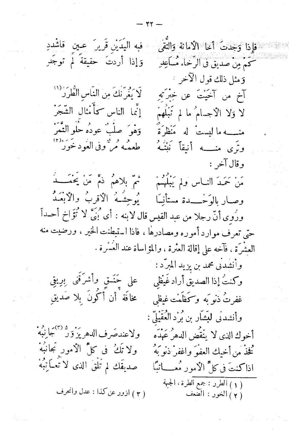 وروي أن رجلاً من عبد القيس قال لابنه: أي بني، لا تواخ أحداً حتى تعرف موارد أموره ومصادرها، فإذا استبطنت الخبر، ورضيت منه العشرة، فآخه على إقالة العثرة، والمؤاساة عند العُسرة.