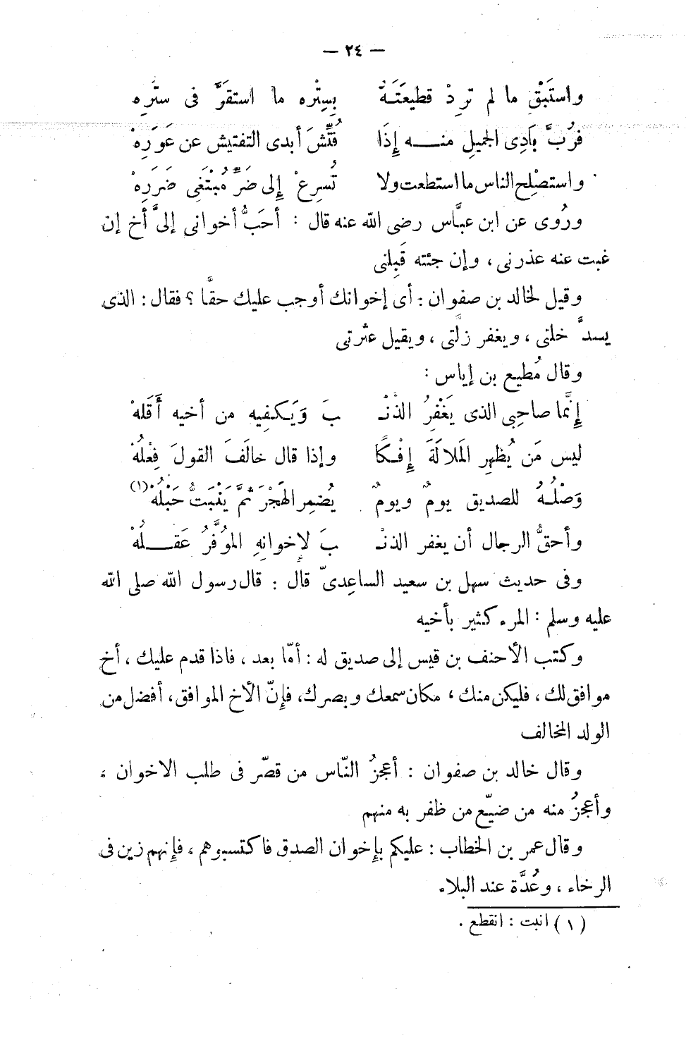 وروي عن ابن عباس، رضي الله عنه، قال: أحب إخواني إليَّ أخ إن غبت عنه عذرني، وإن جئته قبلني. وقيل لخالد بن صفوان: أي إخوانك أوجب عليك حقاً؟ فقال: الذي يسدّ خلتي، ويغفر زلتي، ويقيل عثرتي.
