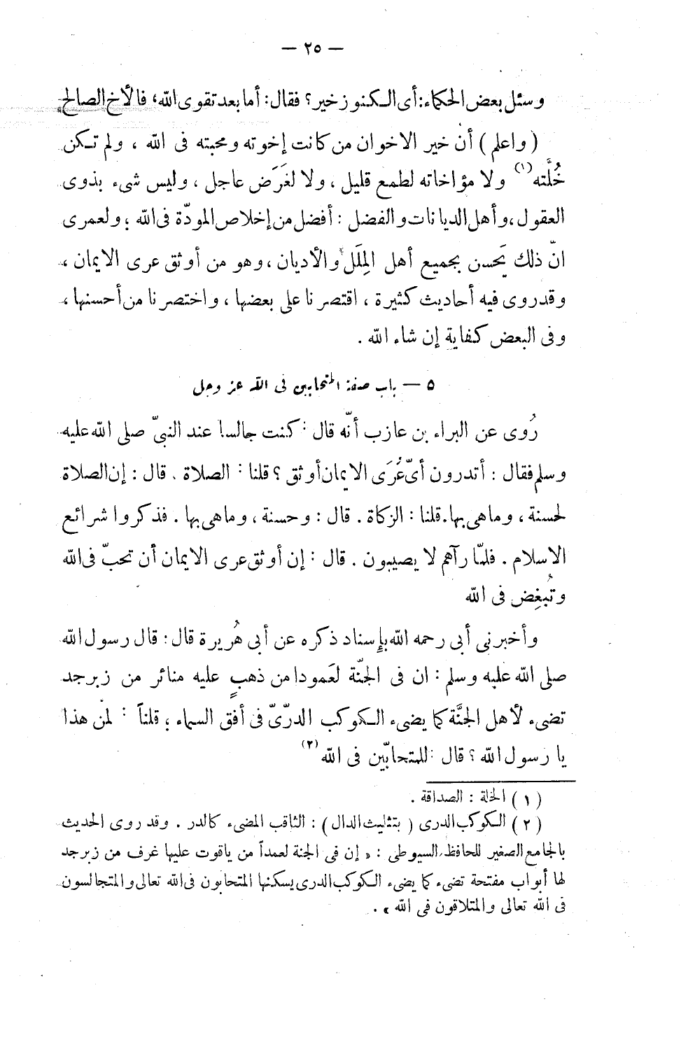 واعلم أن خير الإخوان من كانت أخوته ومحبته في الله، ولم تكن خلته ولا مؤاخاته لطمع قليل، ولا لغرض عاجل، وليس شيء بذوي العقول، وأهل الديانات والفضل، أفضل من إخلاص المودة في الله، ولعمري إن ذلك يحسن بجميع أهل الملل والأديان، وهو من أوثق عُرى الإيمان، وقد روي فيه أحاديث كثيرة اقتصرنا على بعضها، واختصرنا من أحسنها، وفي البعض كفاية، إن شاء الله.