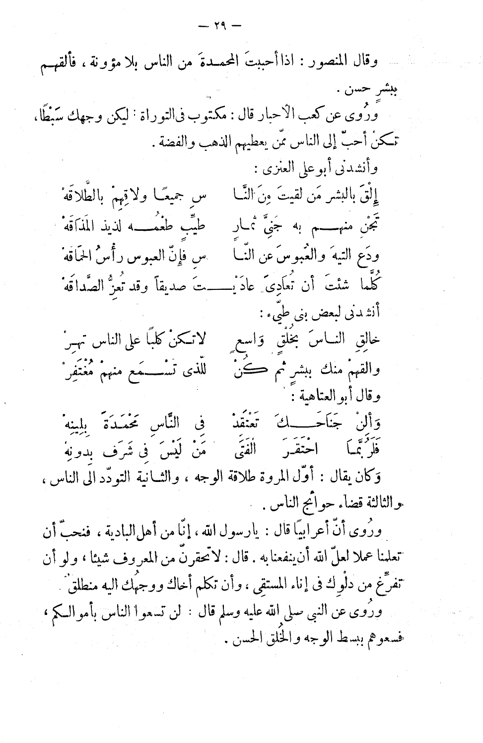 وقال المنصور: إذا أحببت المحمدة من الناس بلا مؤونة، فالقهم ببشر حسن.