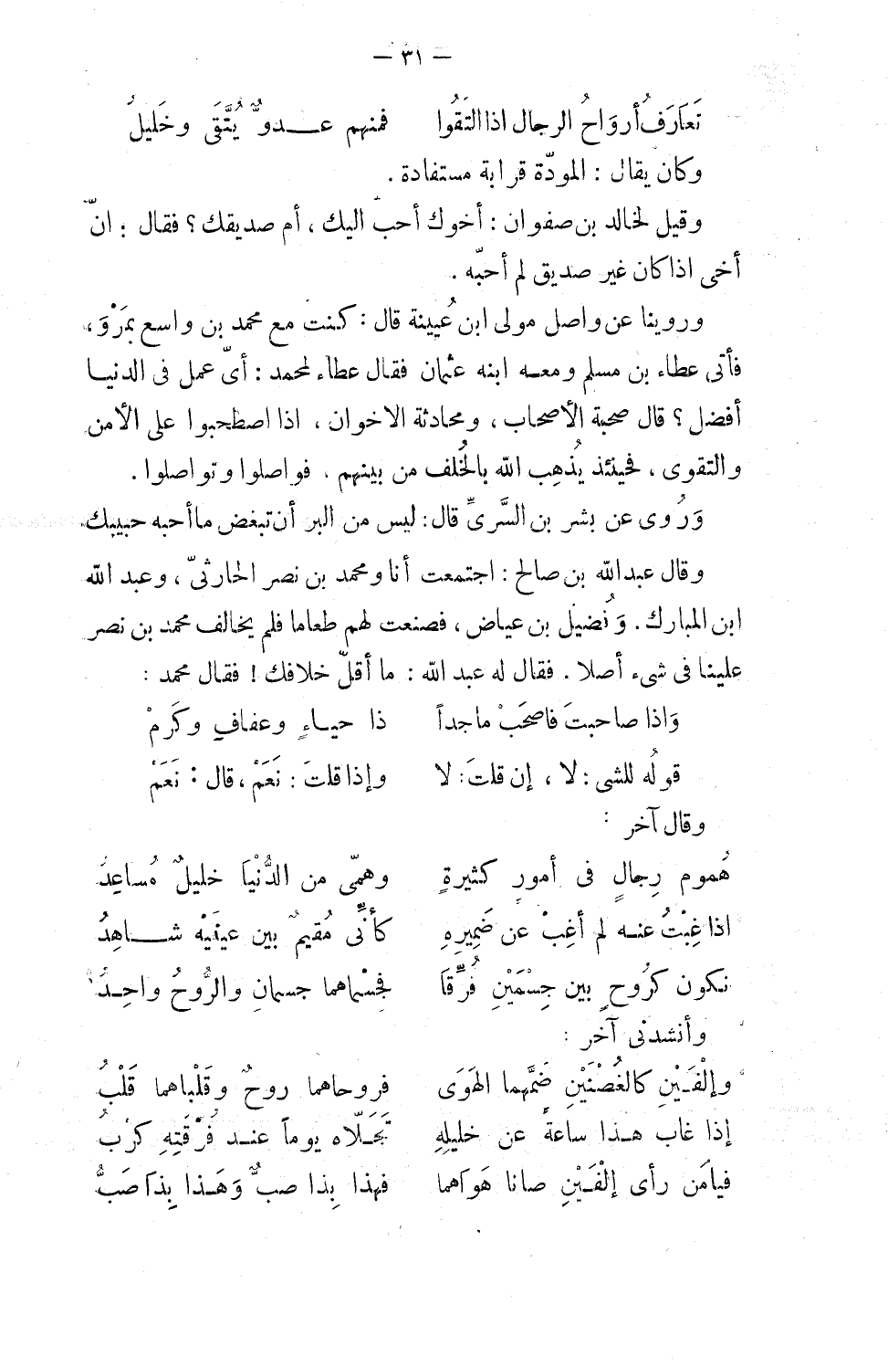 وكان يقال: المودة قرابة مستفادة. وقيل لخالد بن صفوان: أخوك أحب إليك أم صديقك؟ فقال: إن أخي إذا كان غير صديق لم أحبه. وروينا عن واصل مولى ابن عيينة قال: كنت مع محمد بن واسع بمرو، فأتى عطاء بن مسلم ومعه ابنه عثمان، فقال عطاء لمحمد: أي عمل في الدنيا أفضل؟ قال: صحبة الأصحاب ومحادثة الإخوان، إذا اصطحبوا على الأمن والتقوى، فحينئذ يذهب الله بالحلف من بينهم، فواصلوا وتواصلوا.