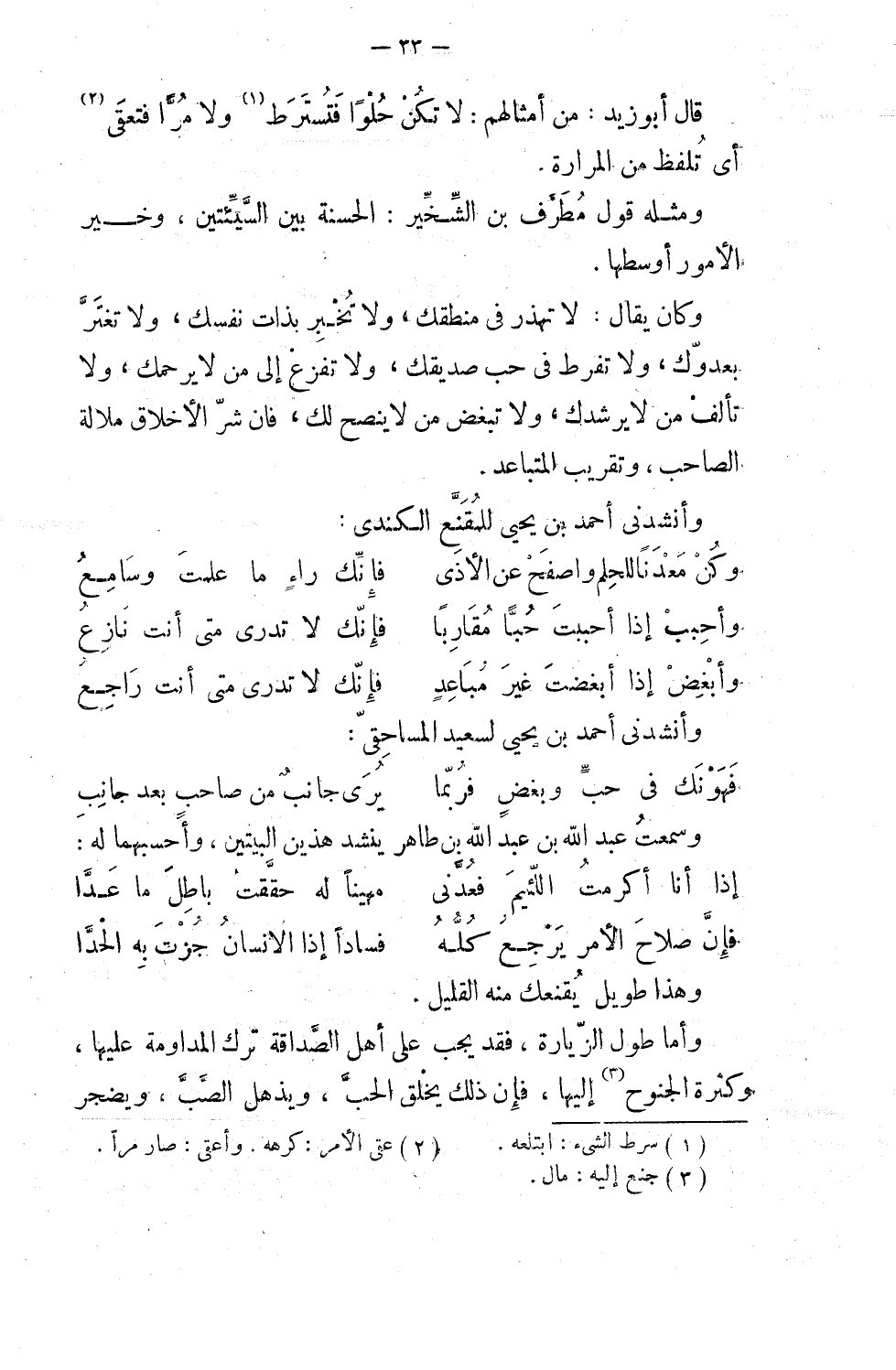 وهذا طويل يقنعك منه القليل. وأما طول الزيارة، فقد يجب على أهل الصداقة ترك المداومة عليها، وكثرة الجنوح إليها، فإن ذلك يخلق الحب، ويذهل الصبّ، ويُضجر