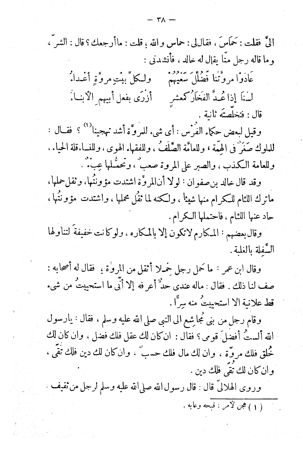 وقيل لبعض حكماء الفرس: أي شيء للمروة أشد تهجيناً؟ فقال: للملوك صغر في الهمة، وللعامة الصَّلف، وللفقهاء الهوى، وللنساء قلة الحياء، وللعامة الكذب، والصبر على المروة صعب، وتحملها عبء. وقد قال خالد بن صفوان: لولا أن المروة اشتدت مؤونتها، وثقل حملها ما ترك اللئام للكرام منها شيئاً، ولكنه لما ثقل محملها، واشتدت مؤونتها حاد عنها اللئام، فاحتملها الكرام.