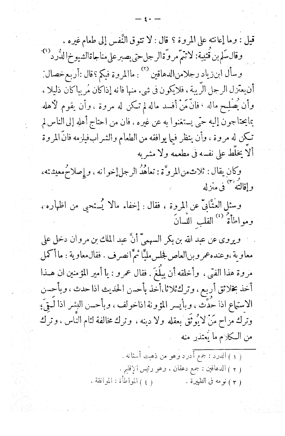 وسأل ابن زياد رجلاً من الدهاقين: ما المروة فيكم؟ قال: أربع خصال: أن يعتزل الرجل الريبة فلا يكون في شيء منها، فإنه إذا كان مريباً كان ذليلاً، وأن يصلح ماله، فإن من أفسد ماله لم تكن له مروة، وأن يقوم لأهله بما يحتاجون إليه، حتى يستغنوا به عن غيره، فإن من احتاج أهله إلى الناس لم تكن له مروة، وأن ينظر فيما يوافقه من الطعام والشراب فيلزمه، فإن المروة ألا يخلط على نفسه في مطعمه ولا مشربه.