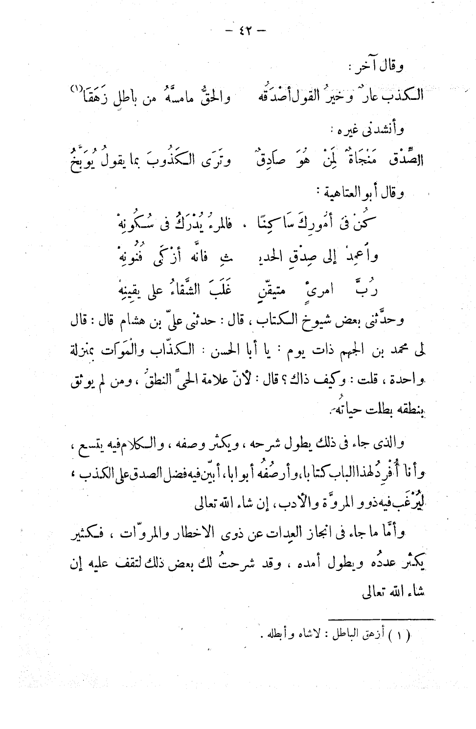 والذي جاء في ذلك يطول شرحه، ويكثر وصفه، والكلام فيه يتسع، وأنا أفرد لهذا الباب كتاباً، وأرصفه أبواباً أبين فيه فضل الصدق على الكذب، ليرغب فيه ذوو المروة والأدب، إن شاء الله تعالى.